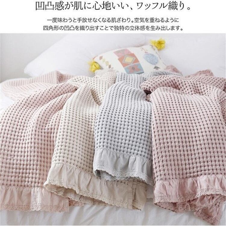 ワッフル織りの薄手で軽いエアコン用毛布。大判サイズで包み込むような心地よさが魅力です。暑い夏でも心地よい温かさを提供し、お昼寝やリラックスタイムに最適です。シンプルな無地デザインで、お部屋のインテリアにも馴染みます。